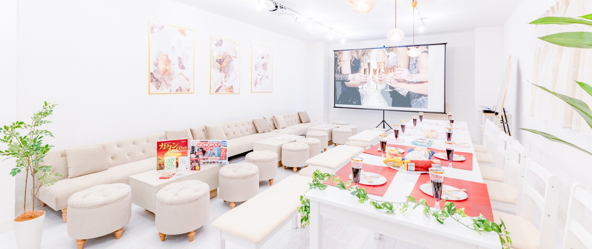 大画面スクリーンやプロジェクター、大人気ゲーム機や、各種ボードゲーム、カードゲームもご用意しております🎲